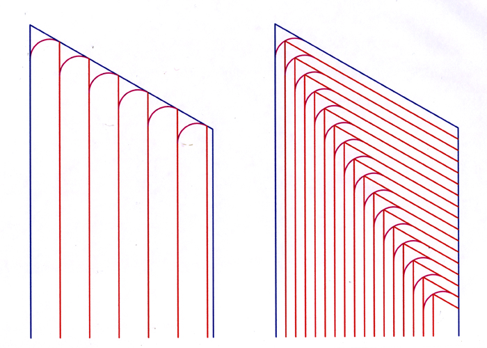 The two drawings below show the importance of face and top grinding together, as opposed to face grinding alone. The drawings are not exactly to scale, and for clarity I've greatly exxagerated the amount of wear. Starting with a new, sharp tip shown in blue, I've drawn in a magenta radius to depict the wear. In order for the saw to be sharp, this radius must be completely ground away. The red lines show the successive grinds. On the left, I've shown how much material must be removed from the face in order to remove the wear. In a real life situation, you could only grind off a little more than half to two thirds of the thickness of the tooth before it became to thin to support itself above the shoulder of the saw plate. In the right hand drawing I've used exactly the same wear radius, but I've taken half of it off of the face and half off the top. Notice how many more grind cycles we get. In addition, we can now grind the tooth even thinner because there is progressively less carbide left unsupported up above the saw plate.